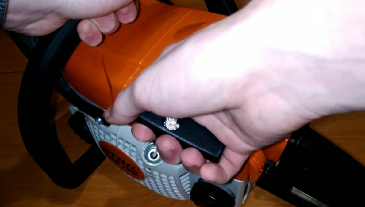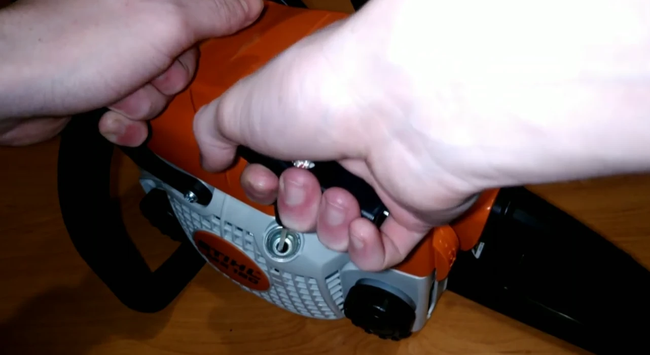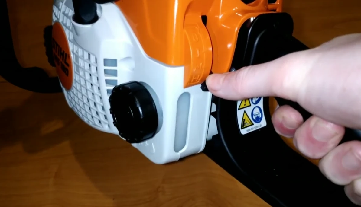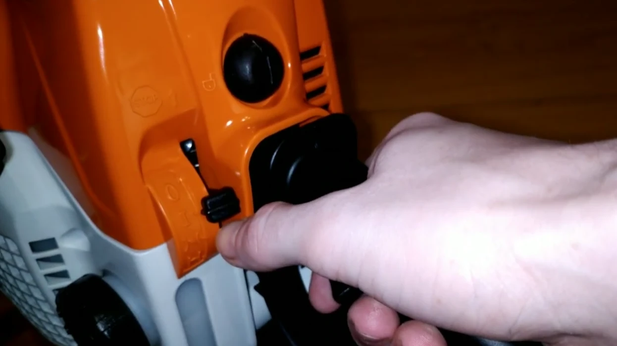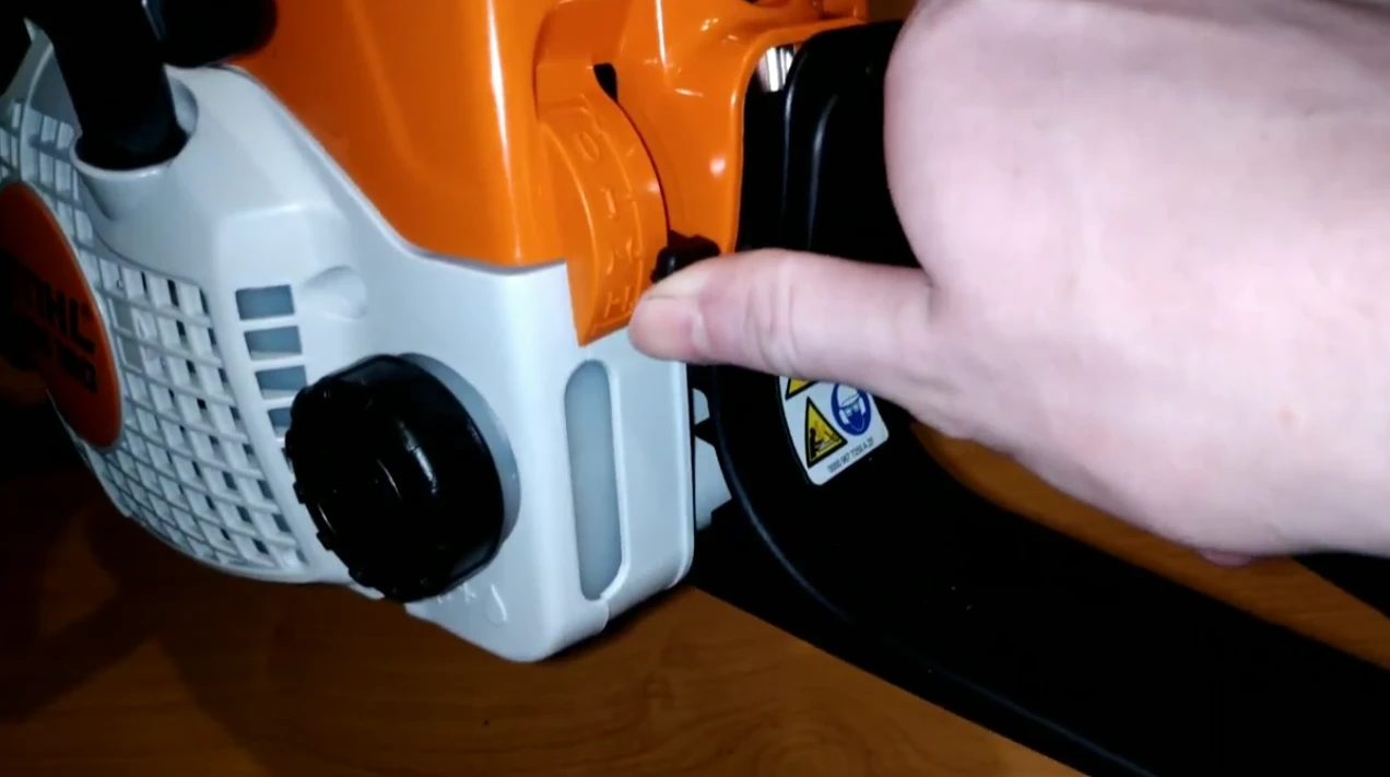 И не забудьте включить цепной тормоз. Для этого переведите переднюю защиту руки вперед до характерного щелчка. Это простое движение фиксирует цепь и делает запуск безопаснее.