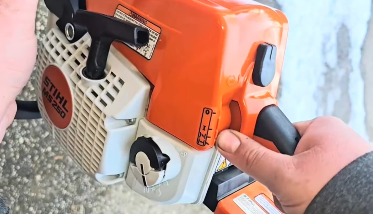 С бензопилой Stihl MS 250 логика запуска остается такой же, как у 170-й и 180-й. Рычажок здесь имеет те же четыре положения. Последовательность действий аналогичная. Но есть нюанс. У MS 250 объем движка побольше. Следовательно, при холодном запуске пила может потребовать на один-два рывка больше. Это нормально.